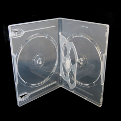 The 14mm Quad 4 Disc CD DVD Case allows you to safely package 4 standard size DVDs or CDs. Made of high quality plastic this 4 Disc DVD Case product features double clips to hold DVD Case inserts, a push button hub for easy media removal, and a clear acetate outer cover that allows for case wrap insert. Both attractive and durable, the 14mm Quad 4 Disc CD DVD Case is a great packaging solution This DVD Box opens/closes like a book. Two disc fit into each side of the box. Another two discs fit into either side of the hinged, middle tray.